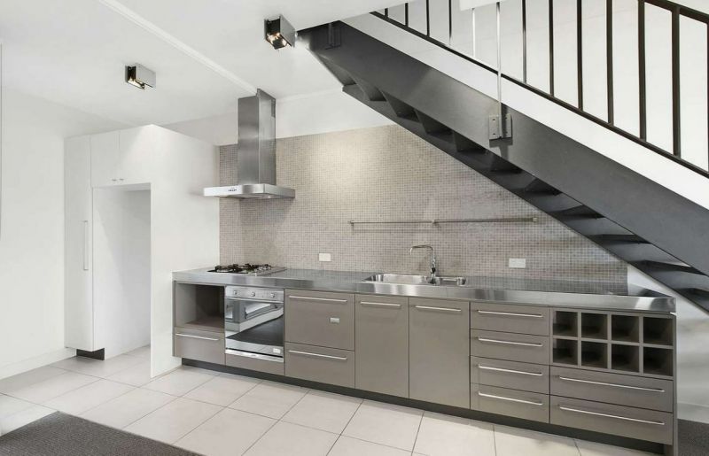 Modern gas kitchen with integrated dishwasher & stainless steel benchtops
