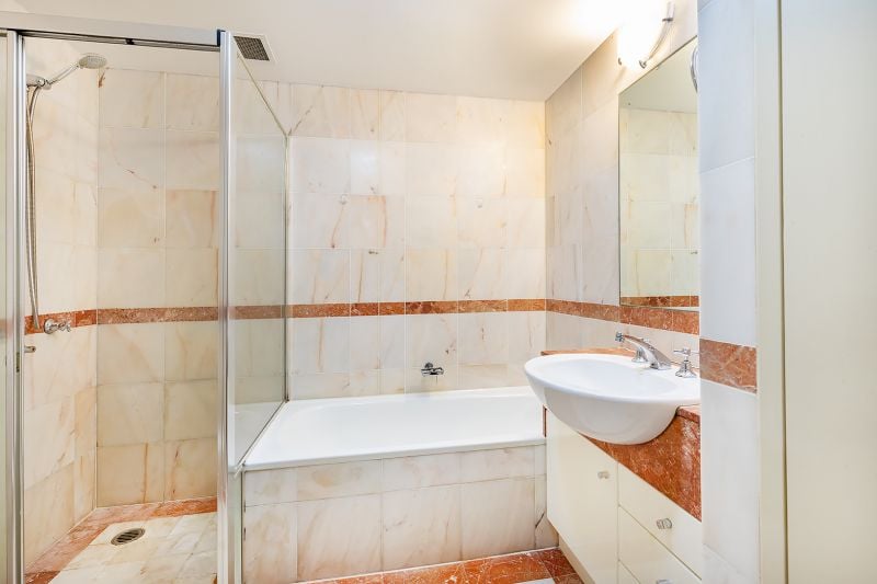 The spacious bedroom includes built-in wardrobes and direct balcony access, while the large bathroom offers both a bathtub and separate shower, plus an internal laundry for added practicality.